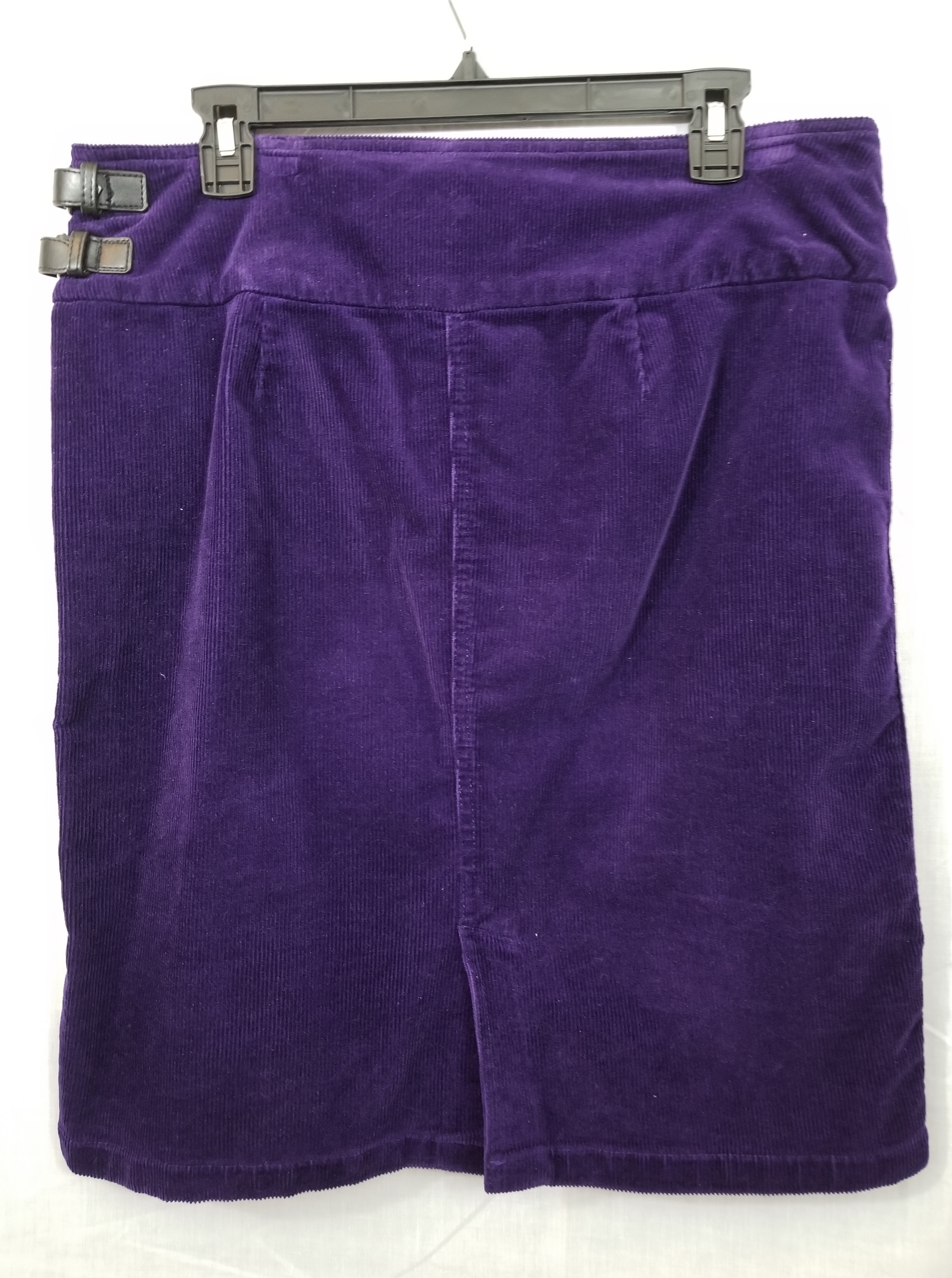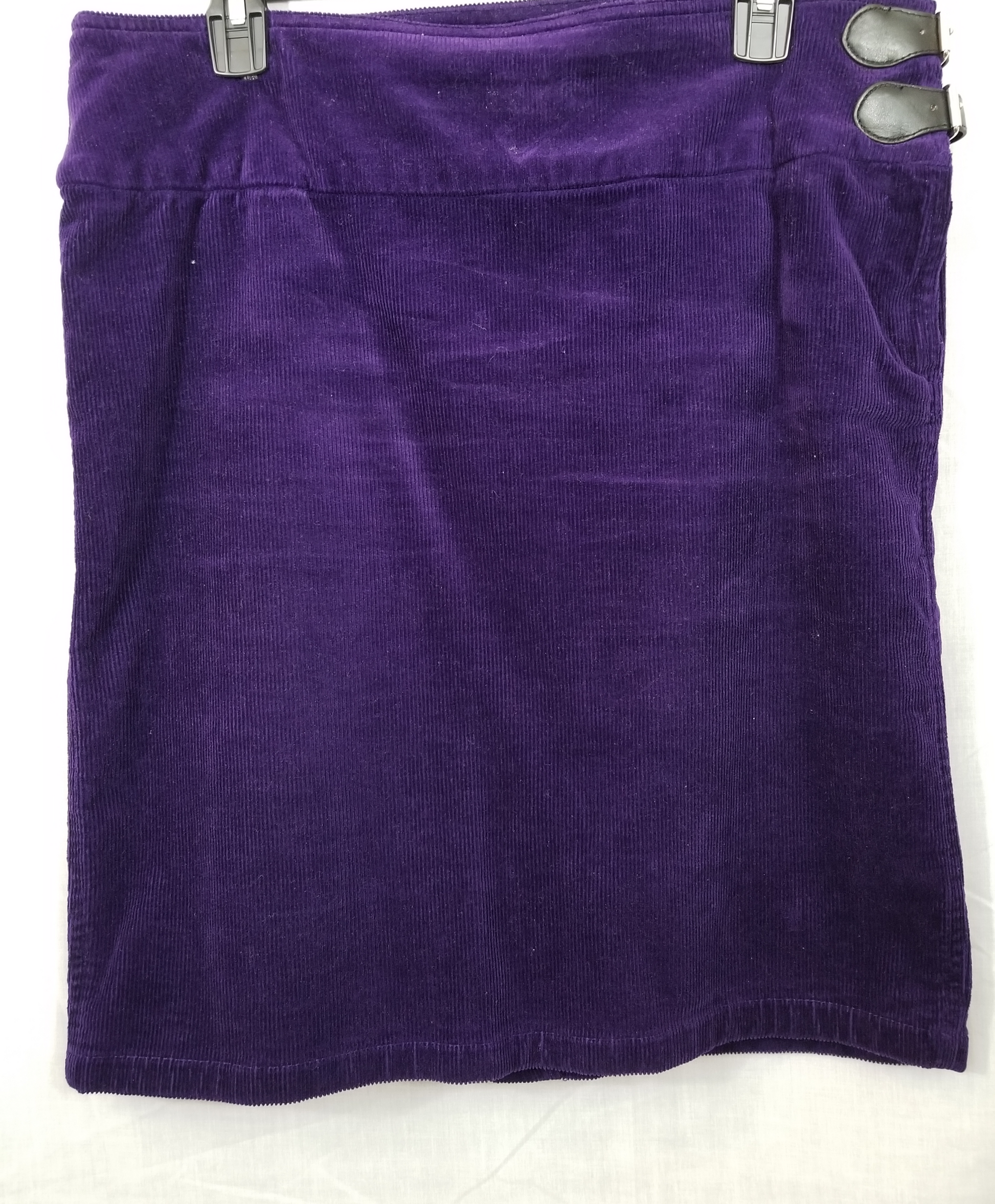 Perfect fit. Fine corduroy, dark purple, little stretch. Size L. Sport it with a black tall boot or mule. Excellent condition.
