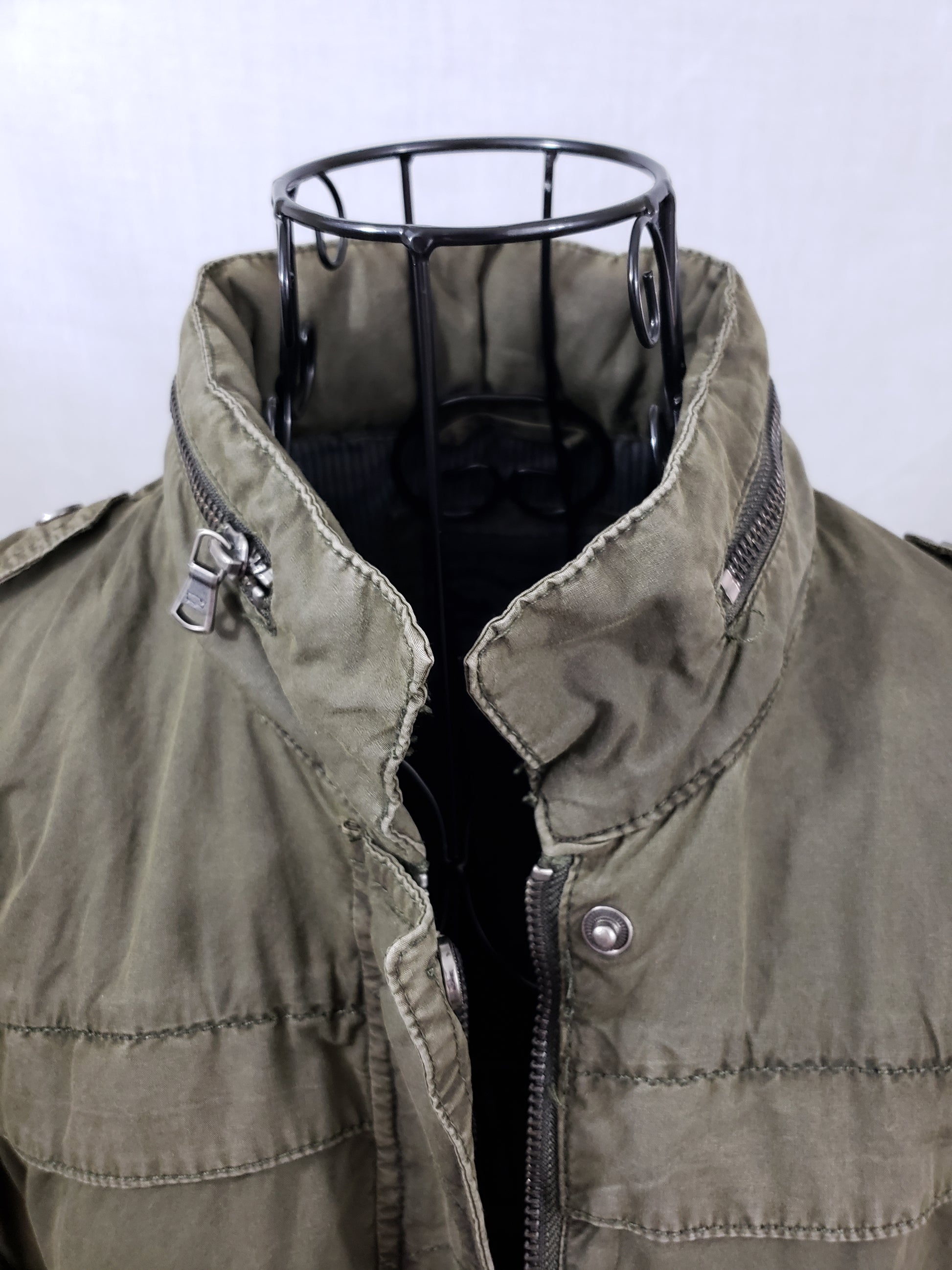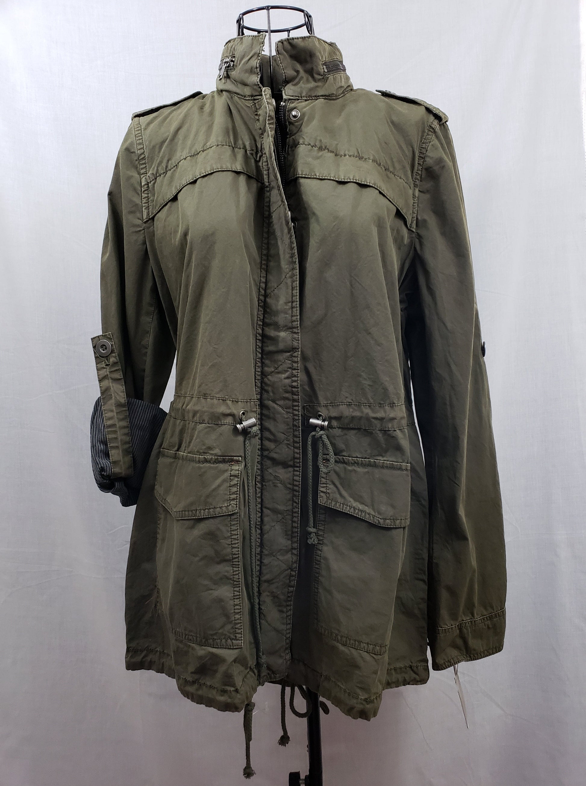 Fabulous. Strauss & Co. New - Very stylish, detail design. Army Green Military Jacket with hoodie, zipped collar storage. Interior pockets, too. This can be worn in spring and winter. Lower back has v-shaped peak with drawstrings. Medium.