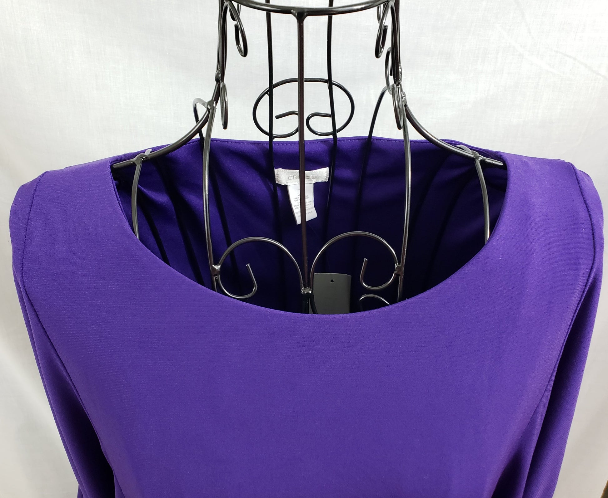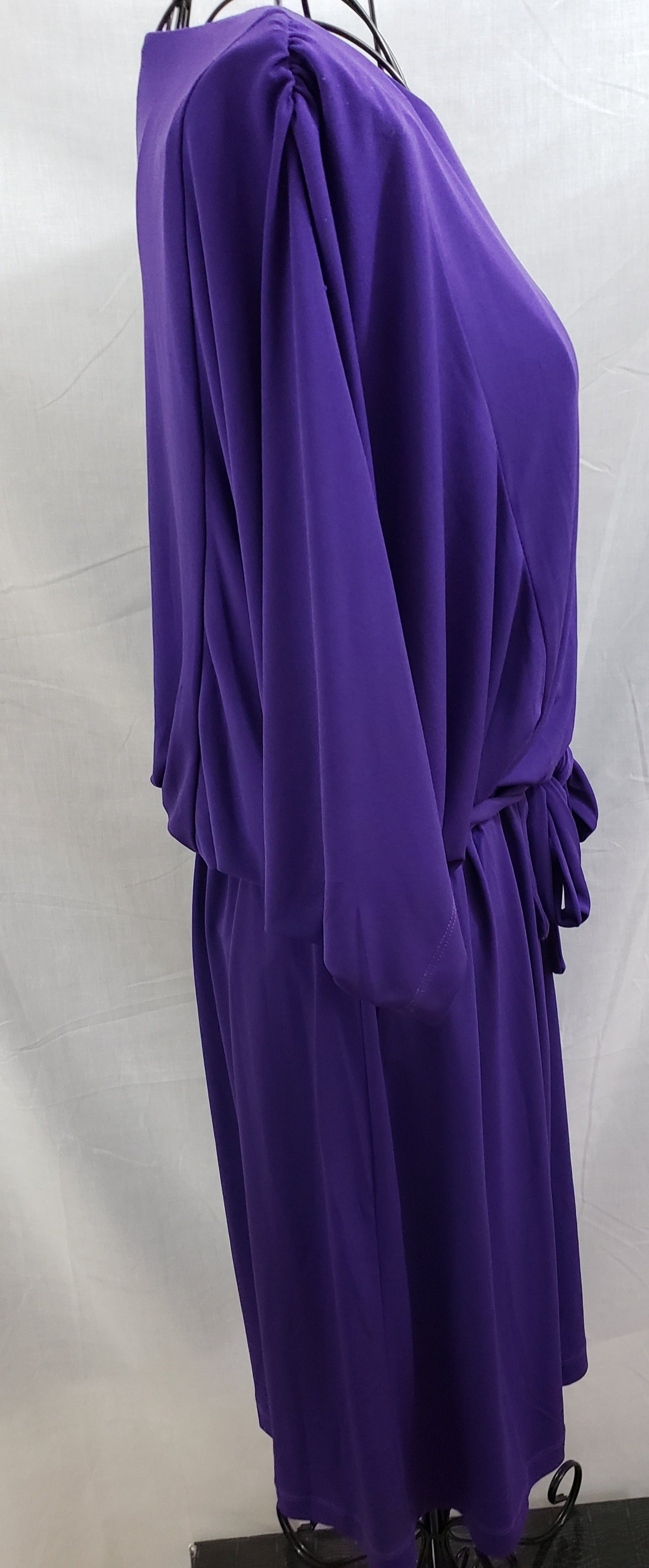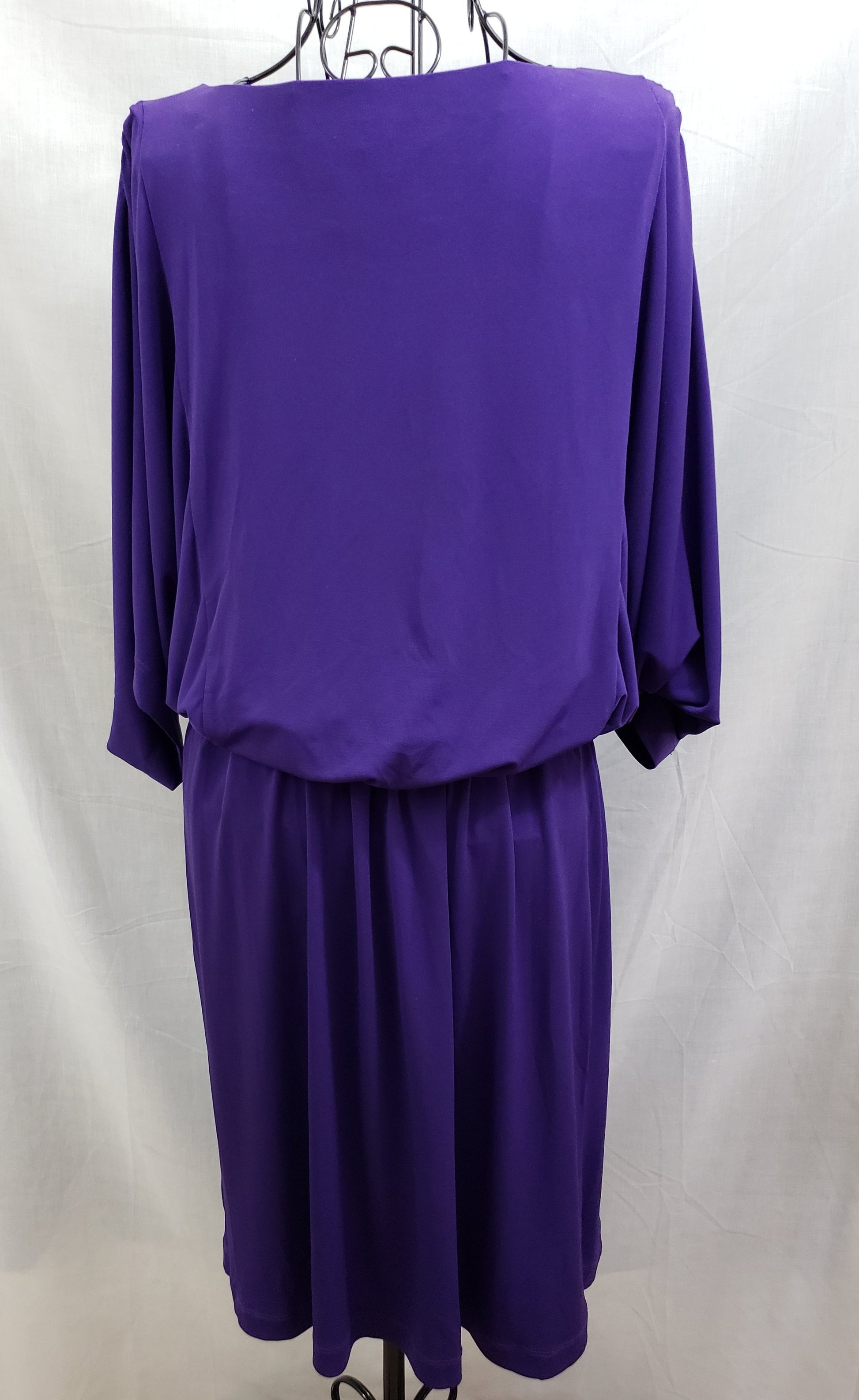 Beautiful Chico's Deep Purple Dress - Belted, Knee-length, Lined, with Wide Sleeve, gathered at Shoulder. Made in Srilanka. Lined. Size 2. 5%. Spandex.