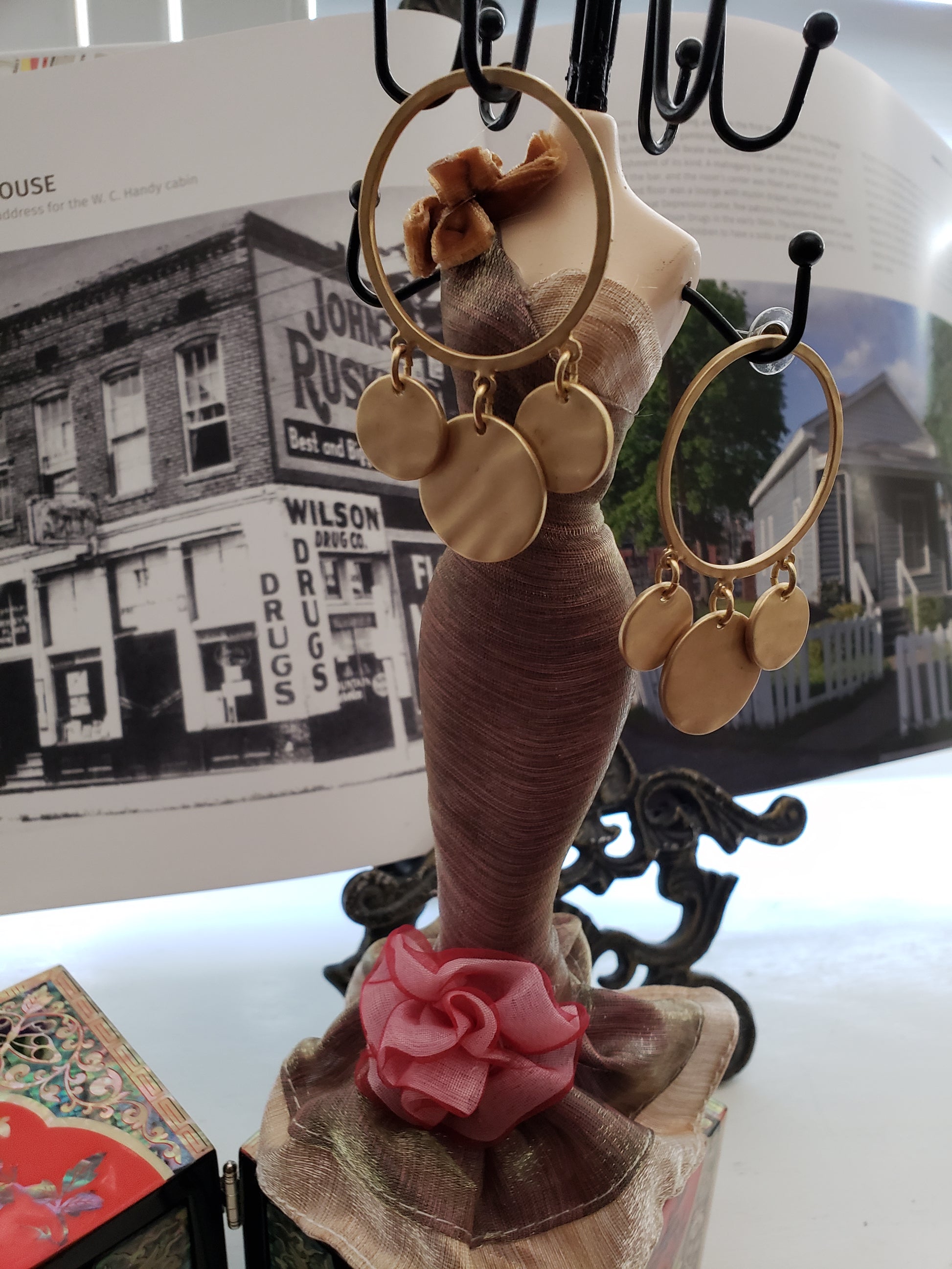 Darling gold circular facing earrings accentuated with three small gold dangling discs.