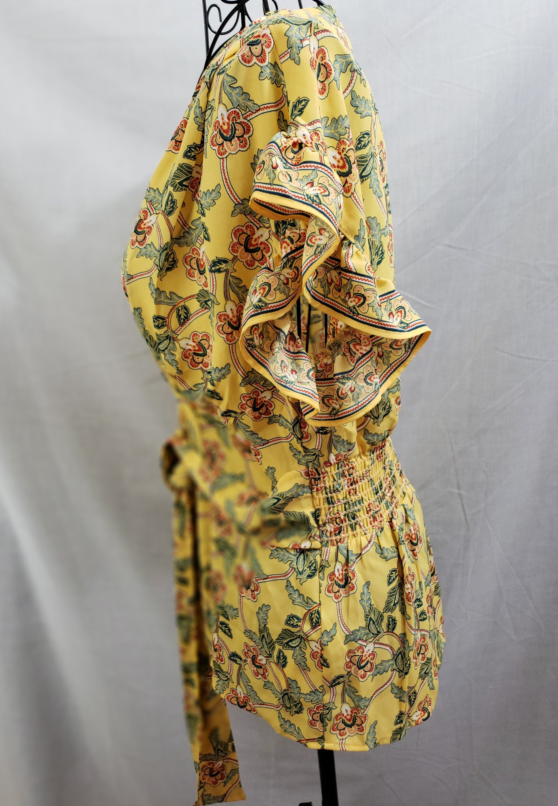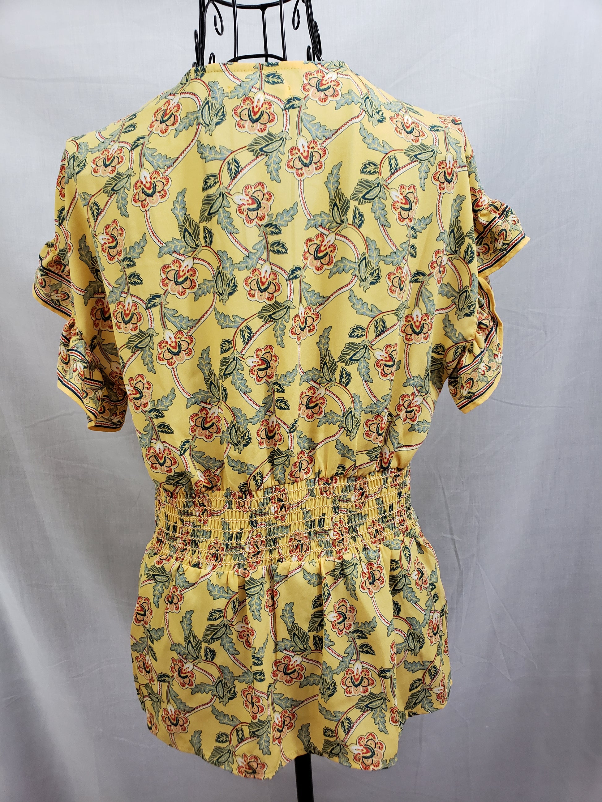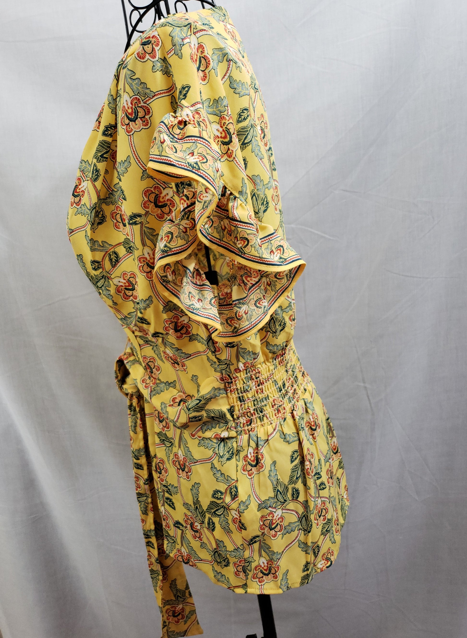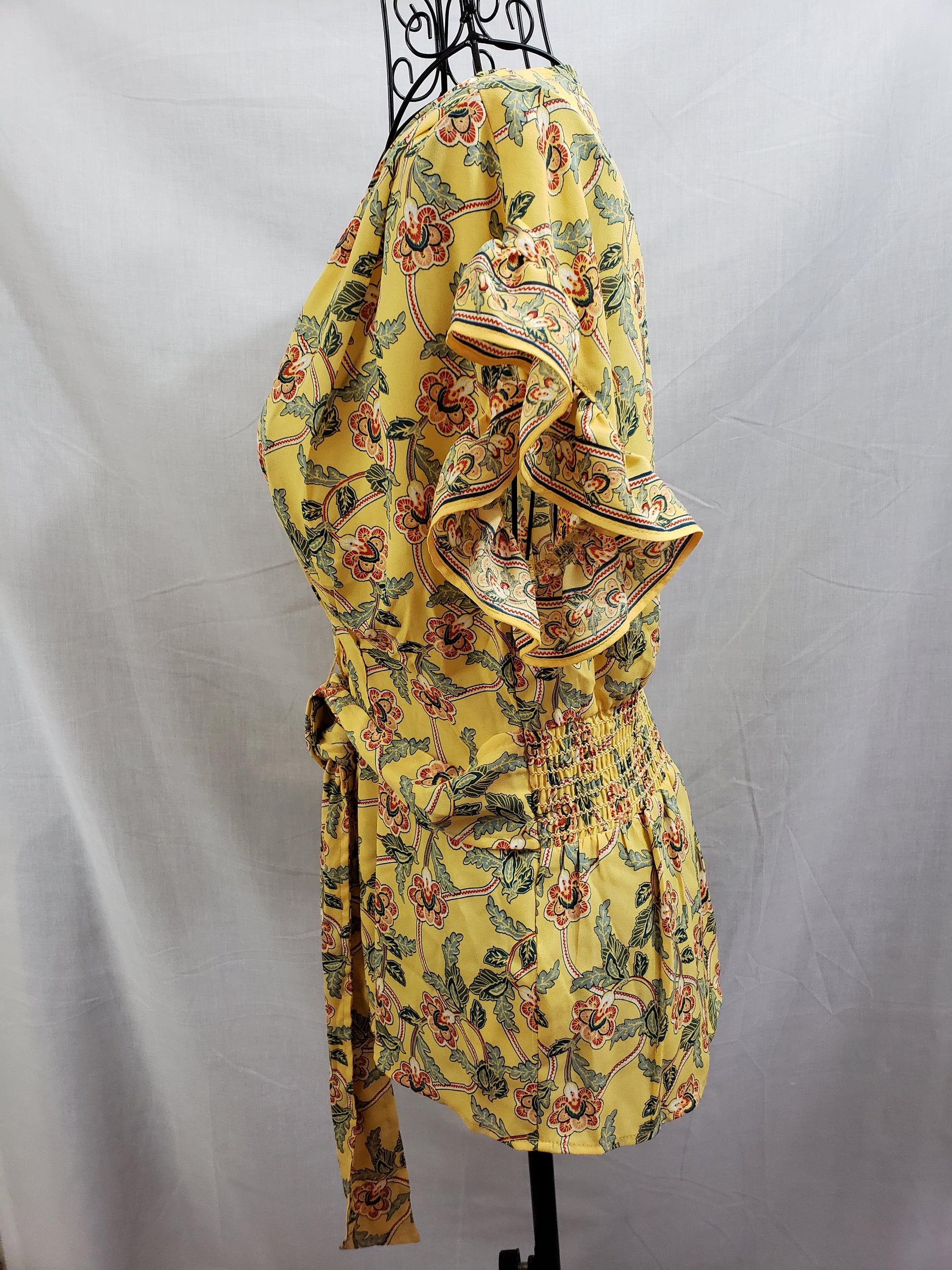 Max Studio Blouse - Yellow/Green/Rose, V-neck - beautiful, ruffled short sleeve, wrap/belted, spandex waist. Size XS. New.