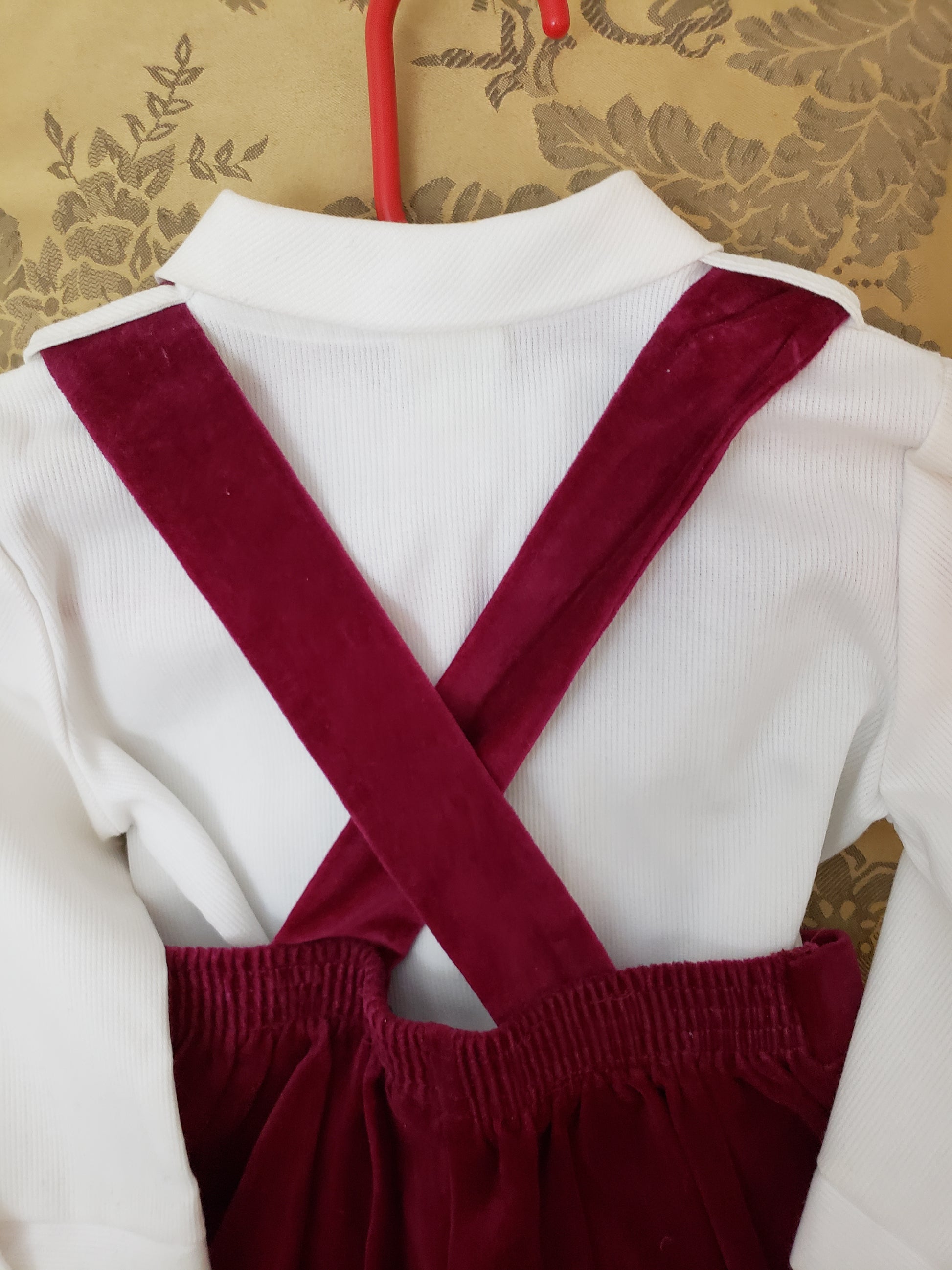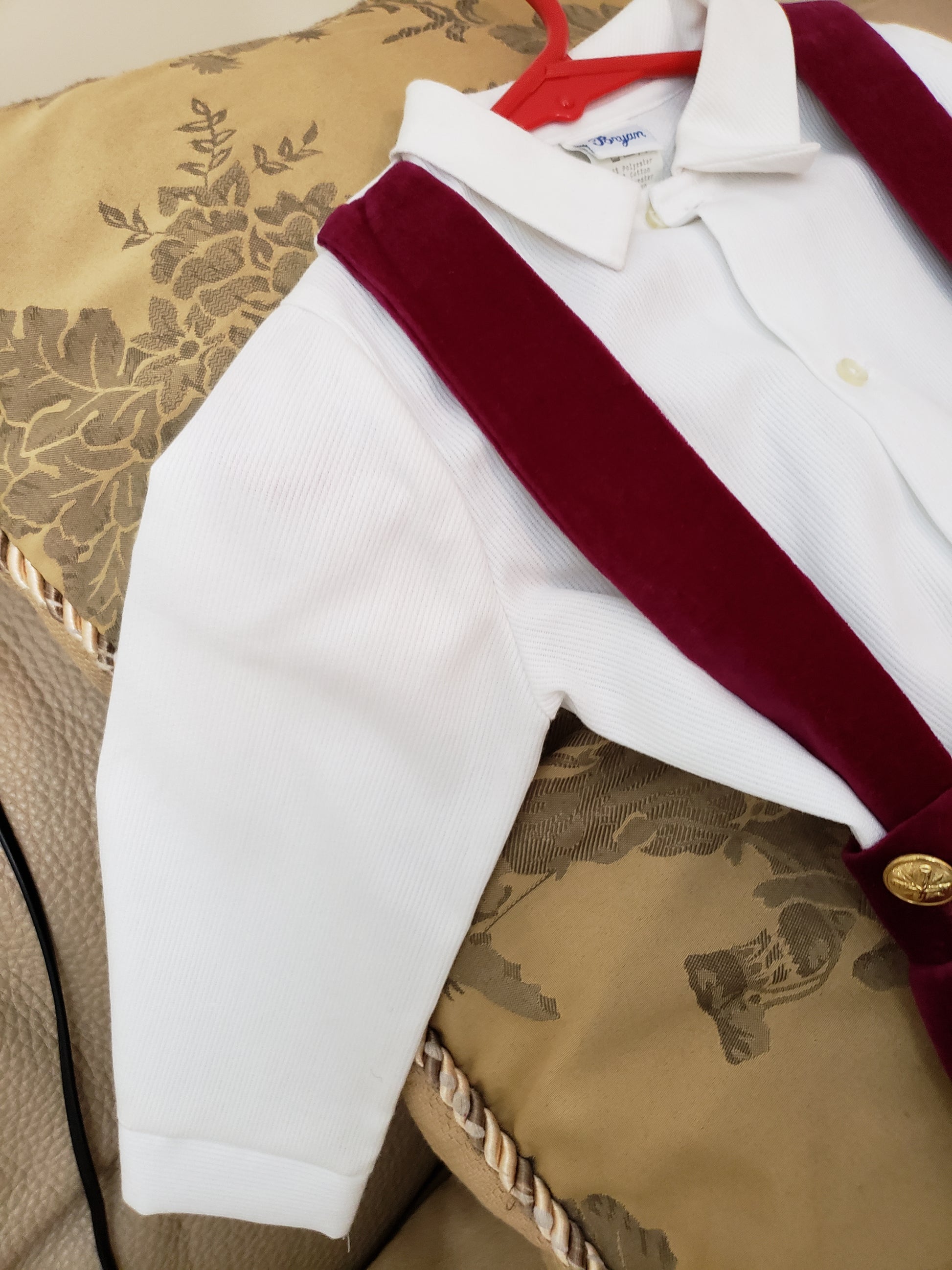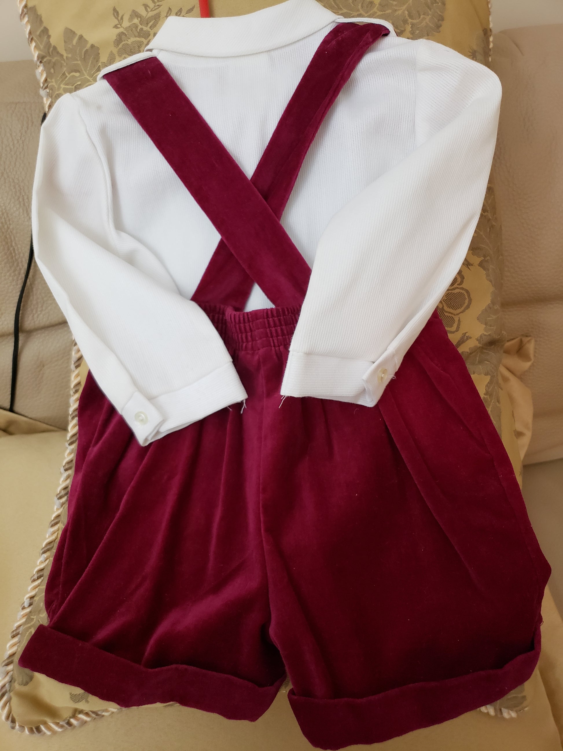 Classic Susan Lively Designs - Boys Burgundy Corduroy Short-set Jumper with suspenders. Off White button down long sleeve shirt. Gold buttons on front of shorts. Size 18 mos.