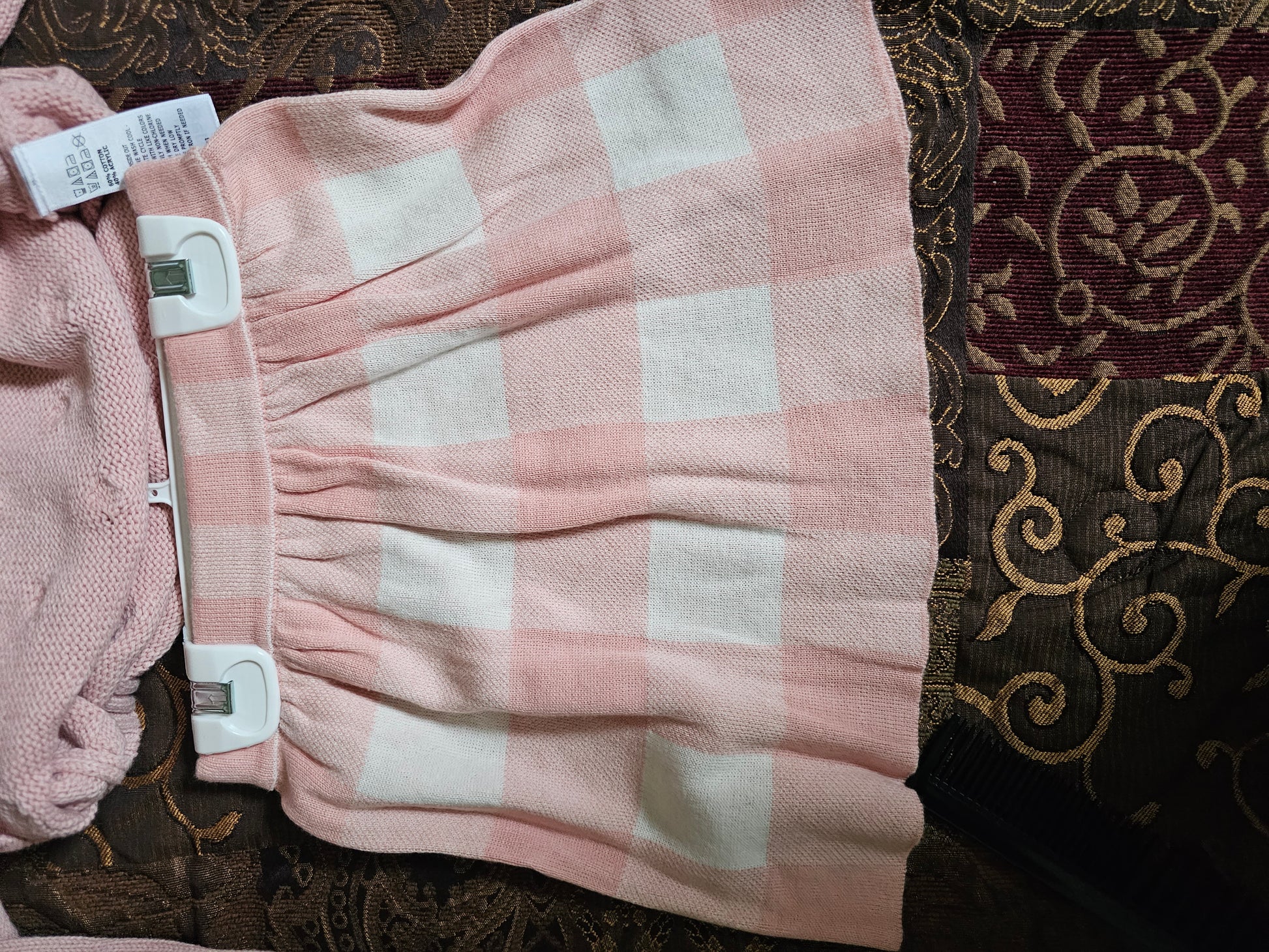 Beautiful Girls Isaac Mizrahi Pink Sweater/Skirt Set, with matching headband. Soft pleated checked pink and white skirt. Pink sweater tone-on-tone embossed dots. Absolutely adorable. Church, school or play. Size 5T.